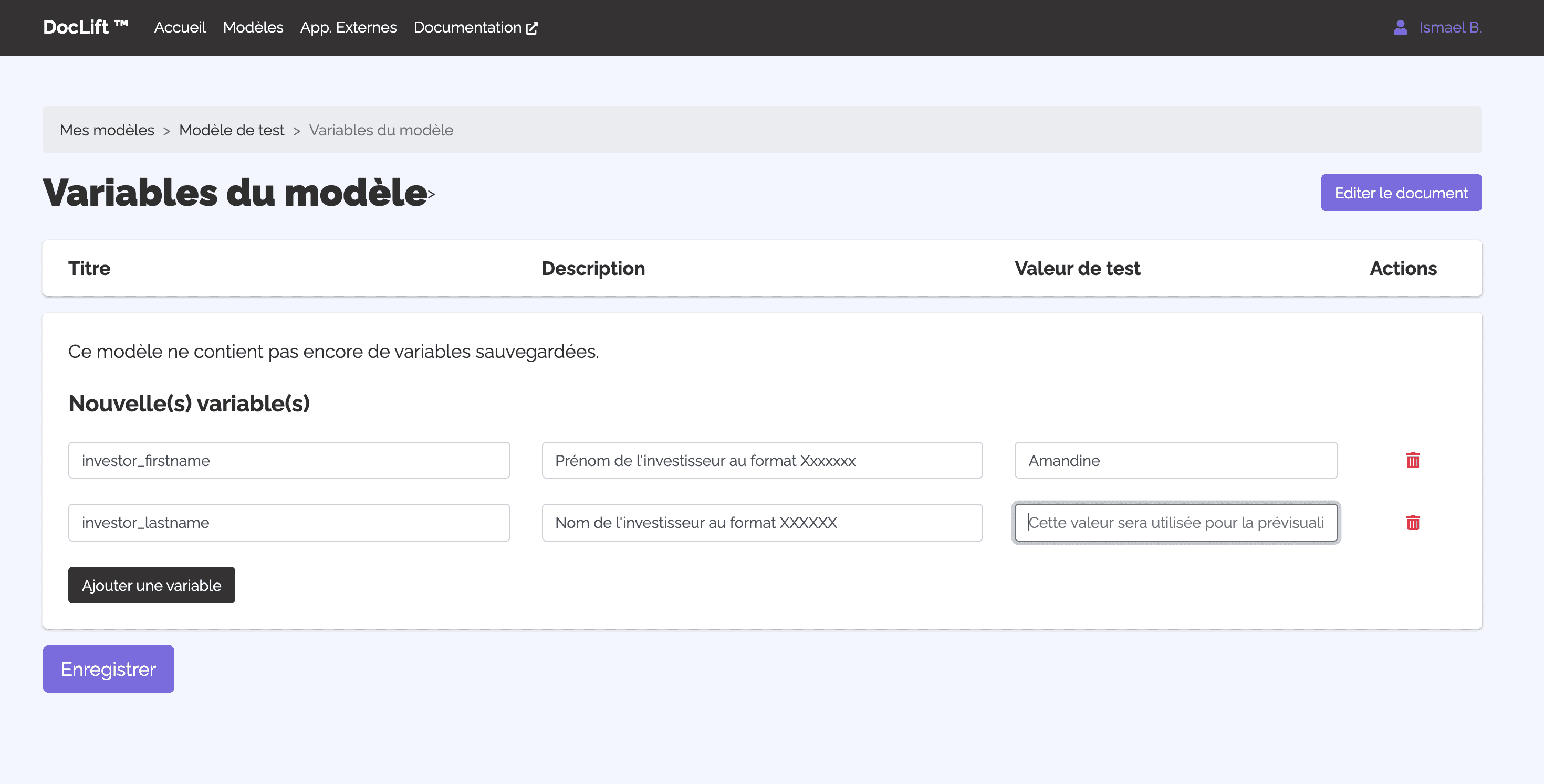 Vous pouvez créer des variables à tout moment directement depuis l'éditeur de DocLift via le menu "Variables" à droite visible sur l'image ci-dessous.